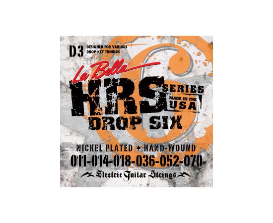 HRS-D3 Hard Rockin Steel Drop Six Комплект струн для электро-гитары. Верхние струны - сталь, басовые струны - стальной керн в никелированной оплетке. Обладают очень ярким и продолжительным звуком. 11-14-18-36-52-70 La Bella