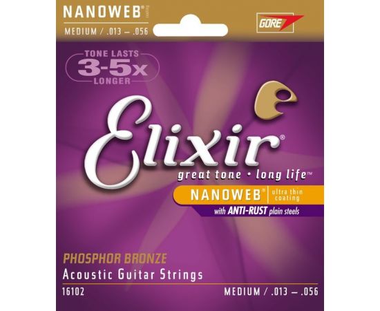 16102 NANOWEB Комплект струн для акустической гитары, Medium, фосфорная бронза, 13-56, Elixir